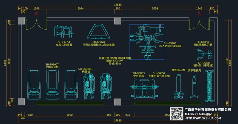 此方案要求面积小于88m²,适用于企事业单位、酒店会所、楼盘社区、私教工作室、商用等健身场所,能满10-15人同时健身使用(方案根据场地空间大小、预算、产品需求等进行配置仅为启发性参考)