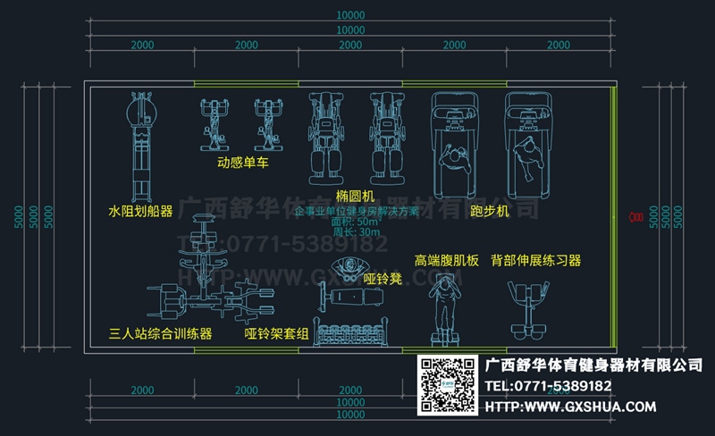 此方案要求面积小于50m²,适用于企事业单位、酒店会所、楼盘社区、私教工作室等健身场所,能满足10-15人同时健身使用(方案根据场地空间大小、预算、产品需求等进行配置仅为启发性参考)