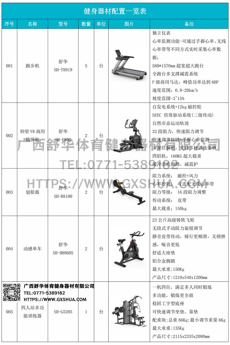 1.好博体育V9跑步机SH-T8919*5台-580*1570mm超宽超大跑台-跑感舒适,跑台整体安全稳定;全跑台多支撑减震平台,保证跑台超强支撑力,达到180kg支撑,满足专业健身房需求。F级商用马达-超强马达,AC 3.0HP 交流,峰值功率达到6HP,F级商用品质。速度范围达到0.8-20km/h;V9跑步机可实现跑台扬升功能,坡度范围-3~15%,满足客户不同的锻炼需求。