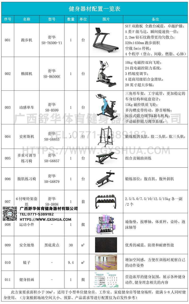 此方案要求面积小于30m²,适用于小型单位健身房、工作室、家庭健身房等健身场所,能满5-8人同时健身使用。(方案根据场地空间大小、预算、产品需求等进行配置仅为启发性参考)
