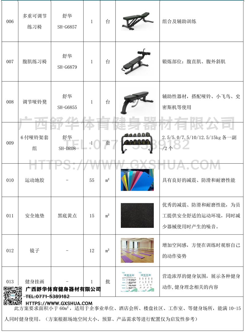 此方案要求面积小于60m²,适用于企事业单位、酒店会所、楼盘社区、工作室、等健身场所,能满10-15人同时健身使用。(方案根据场地空间大小、预算、产品需求等进行配置仅为启发性参考)