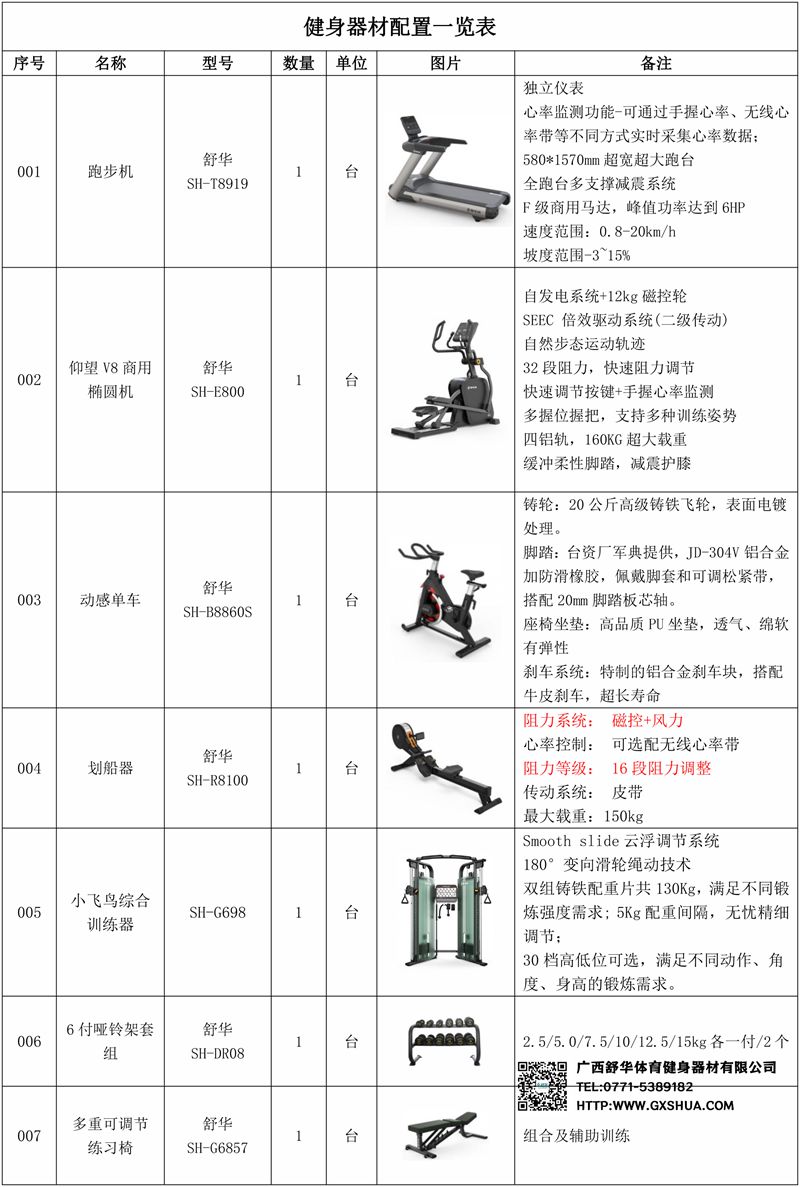 1.好博体育V9智能跑步机SH-T8919*1台-独立仪表-简洁大气,全新外观设计,健康运动新选择;心率监测功能,可通过手握心率、无线心率带等不同方式实时采集心率数据;580*1570mm超宽超大跑台-跑感舒适,跑台整体安全稳定;全跑台多支撑减震平台,保证跑台超强支撑力,达到180kg支撑,满足专业健身房需求。F级商用马达-超强马达,AC 3.0HP 交流,峰值功率达到6HP,F级商用品质。速度范围达到0.8-20km/h;V9跑步机可实现跑台扬升功能,坡度范围-3~15%,满足客户不同的锻炼需求。