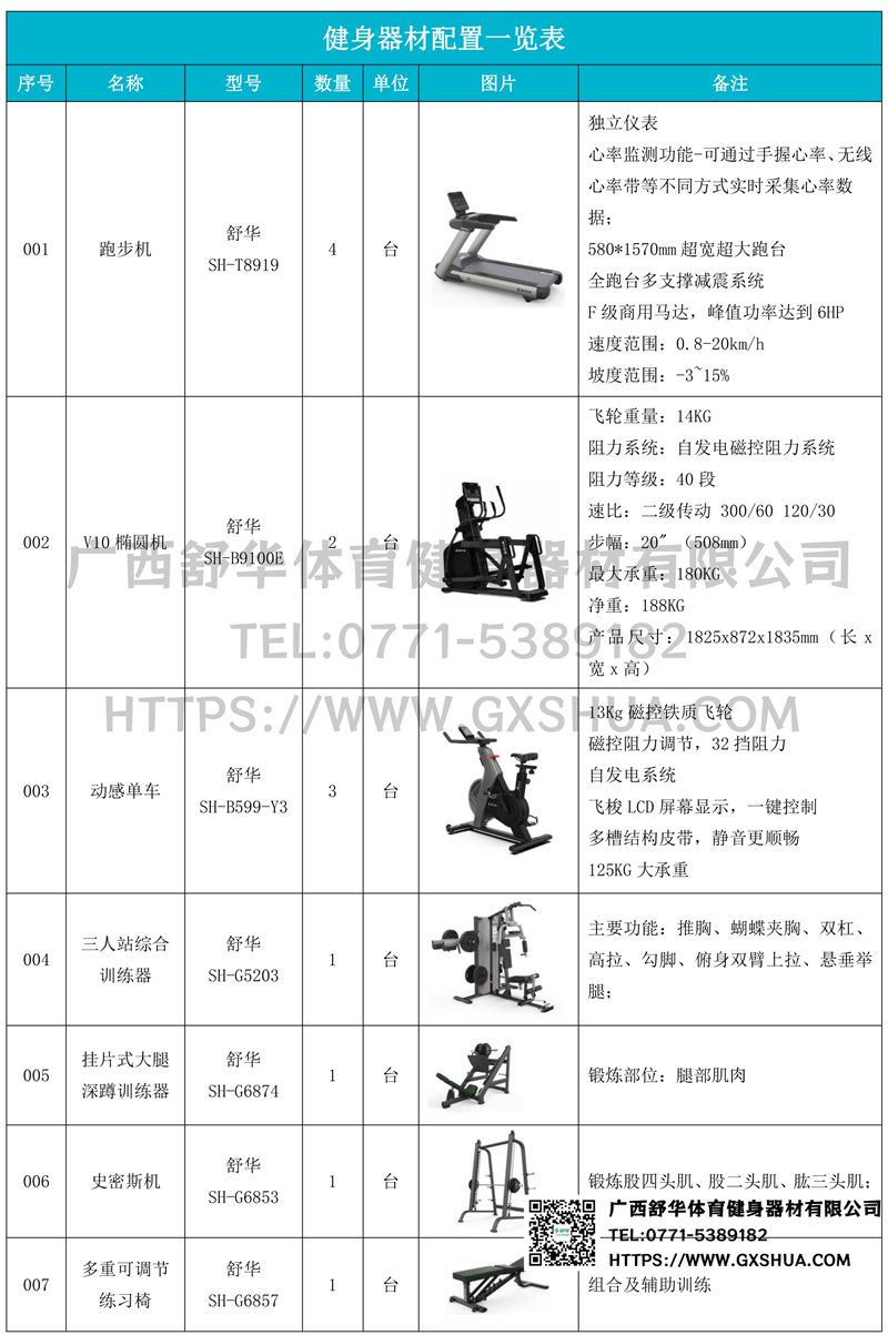 1.好博体育V9跑步机SH-T8919*4台-独立仪表-简洁大气,全新外观设计,健康运动新选择;心率监测功能,可通过手握心率、无线心率带等不同方式实时采集心率数据;580*1570mm超宽超大跑台-跑感舒适,跑台整体安全稳定;全跑台多支撑减震平台,保证跑台超强支撑力,达到180kg支撑,满足专业健身房需求。
