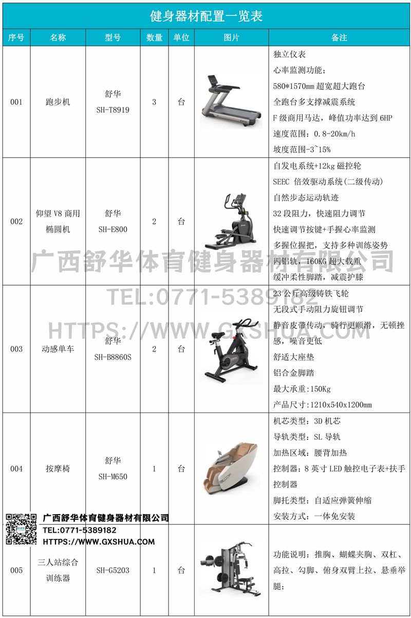 1.好博体育V9跑步机SH-T8919*3台-F级商用马达-超强马达,AC 3.0HP 交流,峰值功率达到6HP,F级商用品质。速度范围达到0.8-20km/h;V9跑步机可实现跑台扬升功能,坡度范围-3~15%,满足客户不同的锻炼需求。