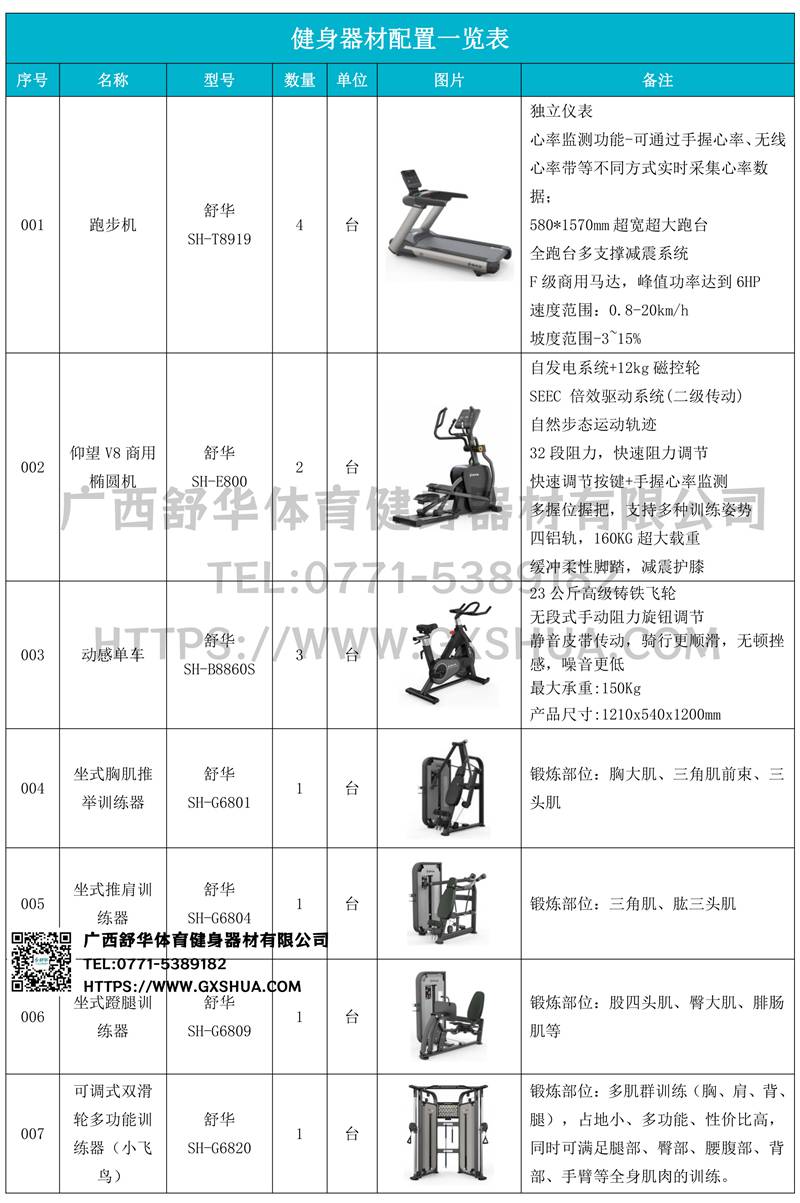 1.好博体育V9跑步机SH-T8919*4台-独立仪表-简洁大气,全新外观设计,健康运动新选择;心率监测功能,可通过手握心率、无线心率带等不同方式实时采集心率数据;580*1570mm超宽超大跑台-跑感舒适,跑台整体安全稳定;全跑台多支撑减震平台,保证跑台超强支撑力,达到180kg支撑,满足专业健身房需求。F级商用马达-超强马达,AC 3.0HP 交流,峰值功率达到6HP,F级商用品质。速度范围达到0.8-20km/h;V9跑步机可实现跑台扬升功能,坡度范围-3~15%,满足不同的锻炼需求。